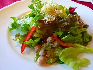 まず、最初にビールがきて、ほどなくきまぐれサラダ登場。彩りもよく、お豆もはいっています。ただ、スペシャルパスタセットのサラダの2倍の量はないみたい。もう少しボリュームがほしいですね。