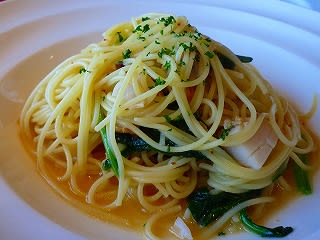 本日のパスタは「小柱と青菜のスパゲッティ ガーリック風味」、