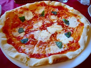 マルゲリータピッツァは、パリパリ薄焼きのローマ風。唐辛子オイルをかけて辛くするとビールがすすみます。