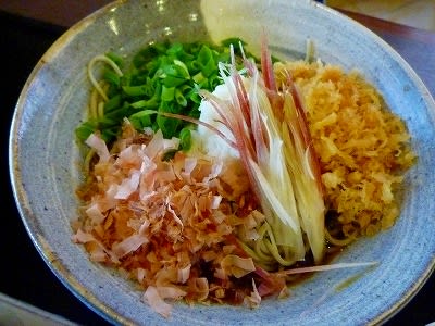 ずんちが注文した薬味おろし※辛味大根、茗荷、青葱、鰹節、揚げ玉のぶっかけそば 1,000円