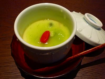 茶碗蒸しはどちらにも共通ですが、ありきたりの茶碗蒸しではないんですよ~。小柱入りの茶碗蒸しの上に青梅のあんと山葵がのってます。見た目もお味も初夏らしくて美味しい♪