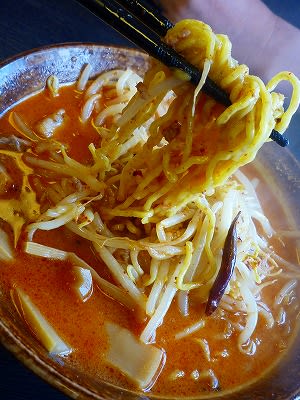 自家製ラー油がきいた辛い味噌ラーメン。唐辛子が1本丸ごとのってて、辛いです。あたくしにはちょっと辛すぎる感じがしましたが、注文したずんちは満足してスープも完飲。