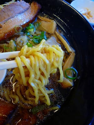 醤油ラーメンは、炙りチャーシュー1枚、メンマ、青葱、玉葱、海苔がのってます。スープは醤油の色が濃く、かなり塩分濃度が高いですが、うまみはあんまり感じられないですね。飲み干すのは困難でした…。看板で大きく宣伝している炙りチャーシューはやわらかくてうまかったです。