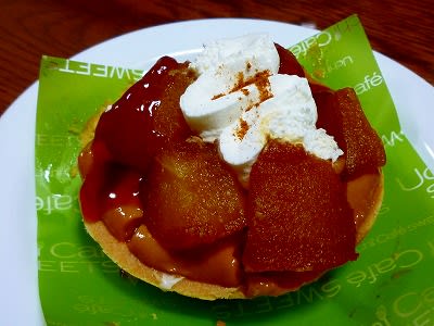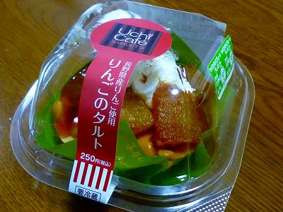 2012-03-04 ローソンの「リンゴのタルト」(関東限定) コンビニスイーツ ローソンの「りんごのタルト」(関東限定) 250円 292kcal 「長野県産りんご使用。 大きくカットしたりんごをふんだんにトッピング。 りんごのシャキシャキした食感が楽しめます。」 りんごがごろごろ~ でも、紅玉のような酸っぱさはありません。 タルト生地は、ぱさぱさであまりいただけませんが、カラメル風味のクリームが美味しかった~♪