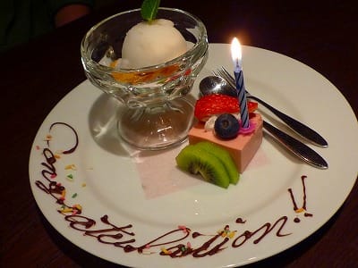 ・水菓子(苺ヨーグルトムース):食事中の会話をきいていたお店の方から「本日はなにかのお祝いですか?」と声をかけられ「実は合格祝いなんです~」と答えたら、ムスコ用は特別バージョンにしてくださいました。