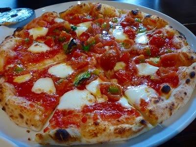 最初は、マルゲリータ。自家製完熟トマトがたっぷりのってます。石窯で加熱されたトマトのなんと甘くてうまいこと!!うまみたっぷりなので、これは絶対のせるべし!