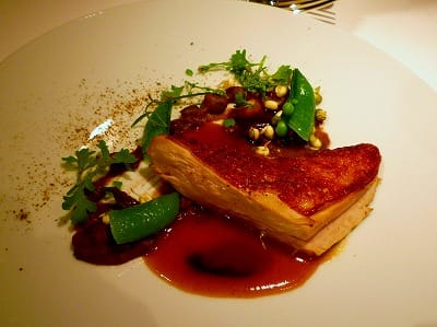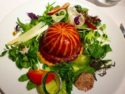 きゃぁ~、色とりどりの野菜に囲まれたパイがかわいい♪9色から選んだラギオールのナイフでざくっと切って、お口に運べば、豚さん・海老さん・フォワグラさんが混然一体となって、文句なしにうまいです。「より道」にしてよかった!