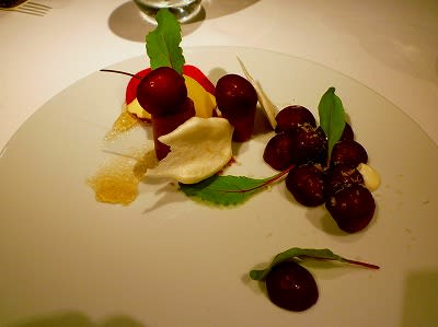 「牧場」木の下で~アメリカンチェリーとアカシアの花のアイスクリーム、ビーツ、フロマージュブラン、オレンジのムラング&チップ