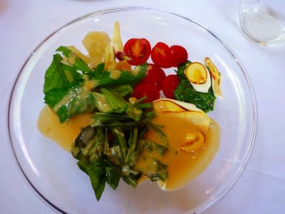 おまかせコースのお料理と泡→ビール→白ワイン甘(シャトー酒折 デラウエア2011)→白ワイン辛(甲州バレル 2011)→日本酒→ブルゴーニュ→ボルドーというバラエティに富んだ飲み物でおひとりさま8,000円也。