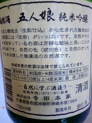 鰻には日本酒!神崎町寺田本家の自然酒 五人娘 純米吟醸