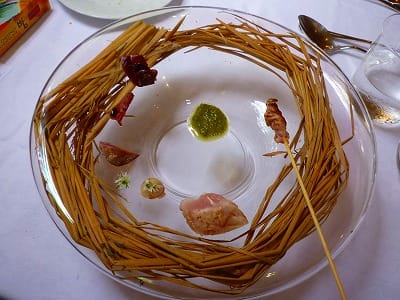 ガラスの器に藁をあしらい、鶏肉にも藁の香りがうつってめちゃうま!自家製の柚子胡椒も辛すぎずにうまいです~。ニラの花ってしっかりニラの味がするんですね。初めていただきました!