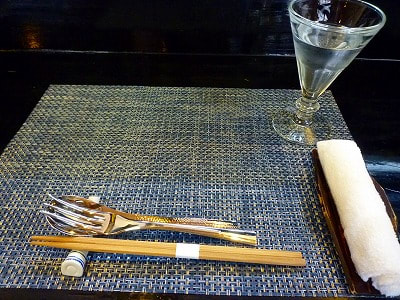 予約の際に「和風イタリアンで」とお願いしておいたので、カウンターにはランチョンマットとカトラリーが2人分セッティングされてます。