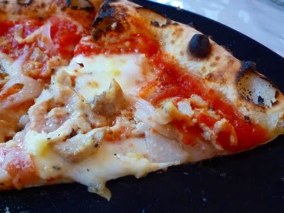 5分後、ガッロも到着。トマトソースにチキンとオニオンのトッピング。こちらもうまいけど、マルゲリータにはかなわないかな。
