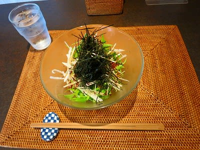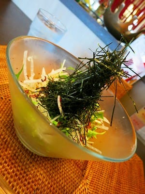 「よく混ぜてからどうぞ」と運ばれたサラダボウルはきっちりと冷やされ、刻み海苔がタワーになってます!