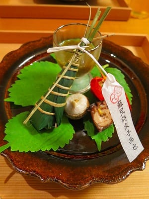 なんと夏らしいお皿でしょう~。厄除け粽を模した鯛粽と胡麻和えのほおづきの器にテンションが上がります。やわらかな蛸さんが超美味!!