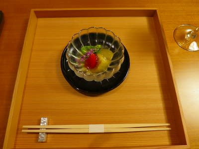 涼しげな先付。丁寧な仕事の施された茄子とトマトが美味しい♪土佐酢ジュレがもう少しまろやかだとよかったかな~