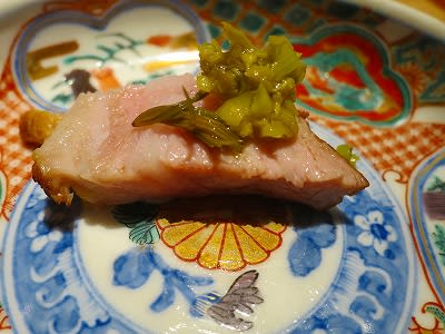 「杉料理」越後もち豚の杉スモーク 杉の新芽のピクルス添え スカンポとまたたびのソース