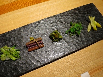 ねまがりたけ、こしあぶらのナムル、ウドの葉のきんぴら、わらび、新玉葱ときゅうり