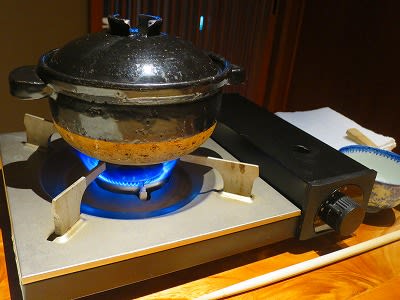 と、ここで、一口ガスコンロと土鍋が目の前にやってきて、自分でご飯を炊き始めます。