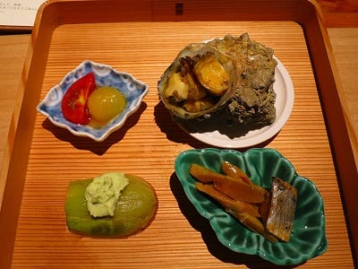 栄螺のみそ焼き、鰊とヒメタケノコ、梵天茄子とソラマメのペースト、トマトのみりん漬け