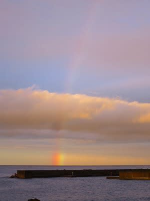 18:05 大間崎から海沿いを走り出すと、水平線からほぼ垂直に立ち上がる虹が!こんな虹初めて見ました!!