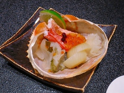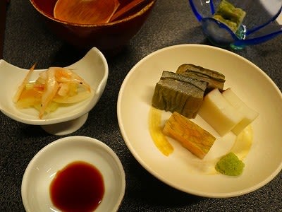 前菜:旬菜五種盛り(海老旨煮、菜の花お浸し、真丈、カナッペ、牛蒡細巻き)
