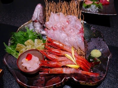 造り:かじき鮪と甘海老昆布〆、富山県産焼蒲鉾