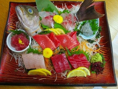 お造り キハダ鮪、ビンチョウ鮪、鮪中落ち、中トロ、いさき姿造り、生しらす