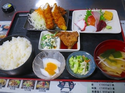 (ヒレカツ・イカフライ、刺身盛り、魚の角煮、レタスの白和え、ごはん、漬物、お吸い物、杏仁豆腐)