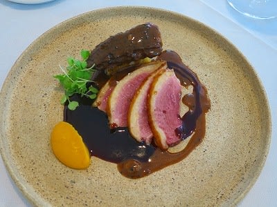 庄内鴨:庄内産バルバリー鴨、カシスと赤ワインソース、鶏のムースを詰めたアミガサタケ(モリーユ)、じゃがいものミルフィーユ、ニンジンのピュレ
