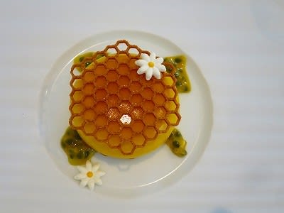 マンゴー:バジルのジュレ入りマンゴームース、アーモンドのチュイル
