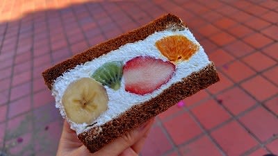 フルーツサンドの生クリームはふわっと軽く、フルーツ5種(バナナ、キウイ、いちご、オレンジ、ぶどう)も美味しくて、やっぱり甘いのも買ってよかった!